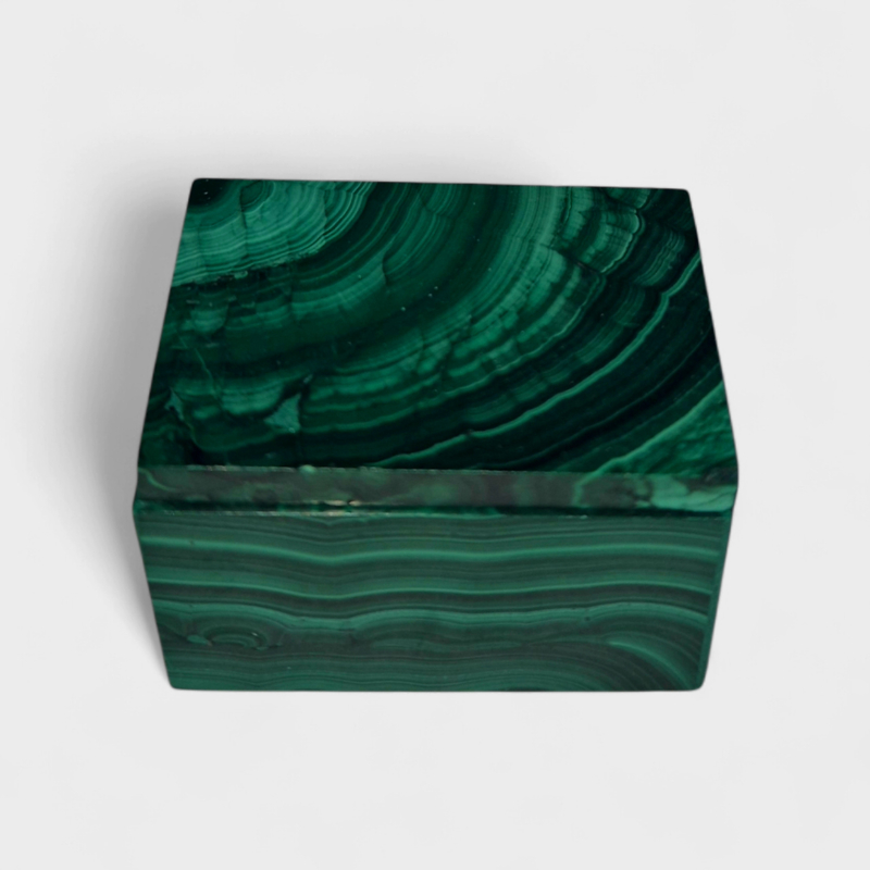 Handgeslepen en gepolijst. Geen gereconstrueerde malachiet maar plaatjes gezaagd uit massieve stukken Malachiet, waaruit het doosje is samengesteld.